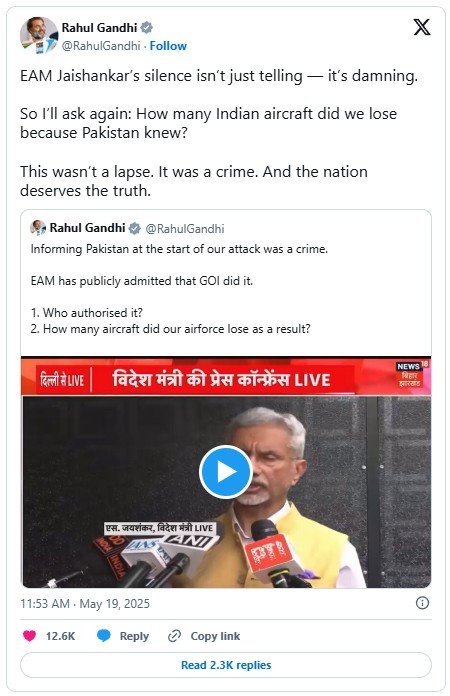 Rahul Gandhi, amplifying the concern, described this not as a “lapse” but a “crime,” questioning the political authority behind the decision and demanding accountability. “Who authorised this communication? How many aircraft did we lose because Pakistan was informed?” he asked. His insistence that “the nation deserves the truth” has struck a chord among many, cutting across political lines.